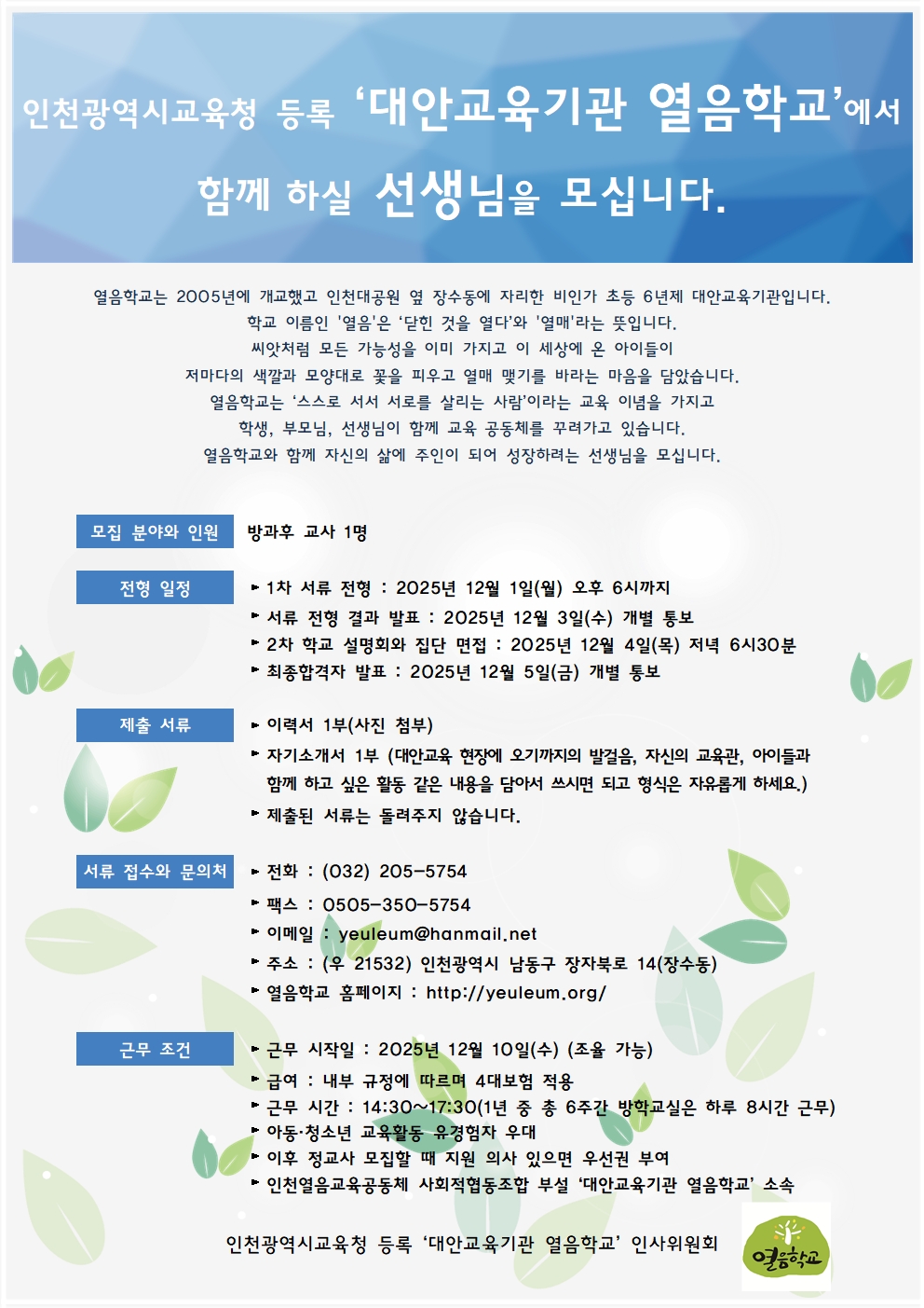 [열음] 대안교육기관 열음학교에서 함께하실 방과후 선생님을 모십니다