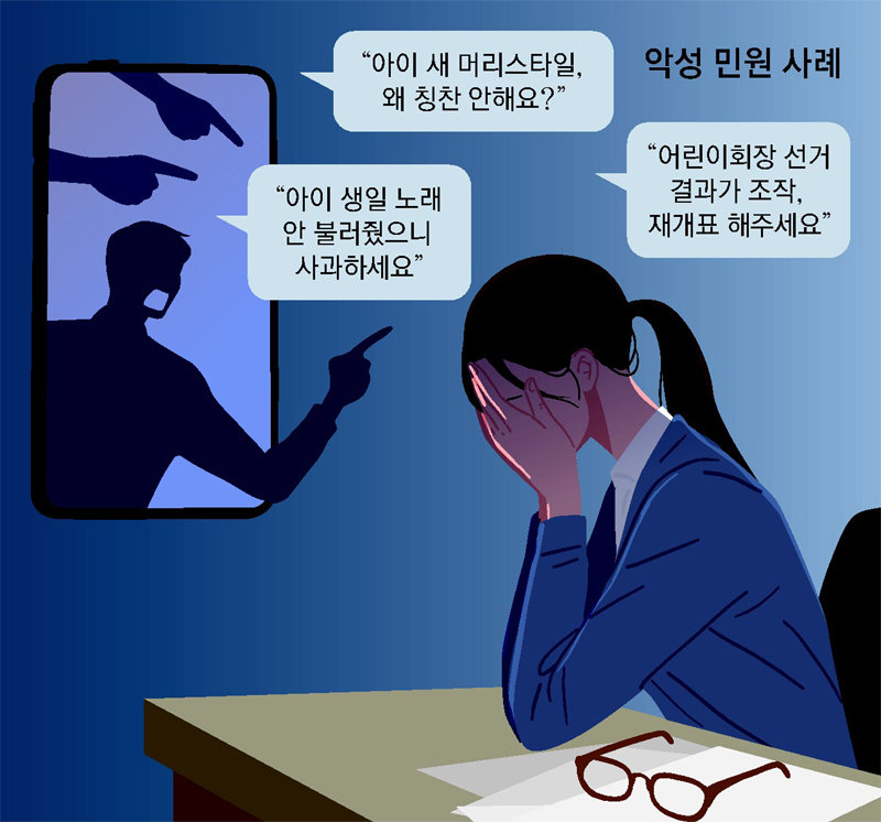 학교폭력 사건의 가해자 학부모가 적반하장으로 민원을 제기하는 경우도 흔하다. 지역 교육청과 도교육청에까지 민원을 넣어 교사를 곤경에 빠트리기도 한다. 교사가 잘못 처리한 경우도 없진 않겠지만, 아이의 일방적인 말만 듣고 교사를 공격하는 부모들이 적지 않다. 시스템이 없으니 감정이 앞서게 되고, 학부모 개인 대 교사 개인의 대결로 치닫게 된다. 악성 민원에 시달리다 병가를 내는 교사들도 적지 않다. 공공영역인 교육 현장이 악성 민원에 휘둘리지 않을 수 있는 장치를 서둘러 마련해야 한다.