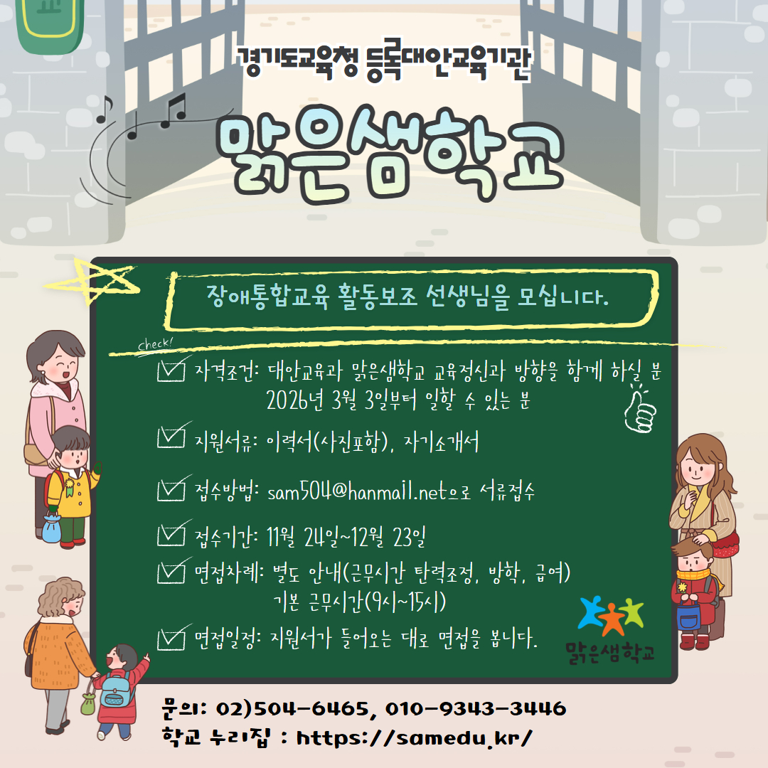 - 모둠 선생과 함께 장애 학생이 안정된 학교생활을 할 수 있도록 도와주실 수 있는 분을 모십니다.