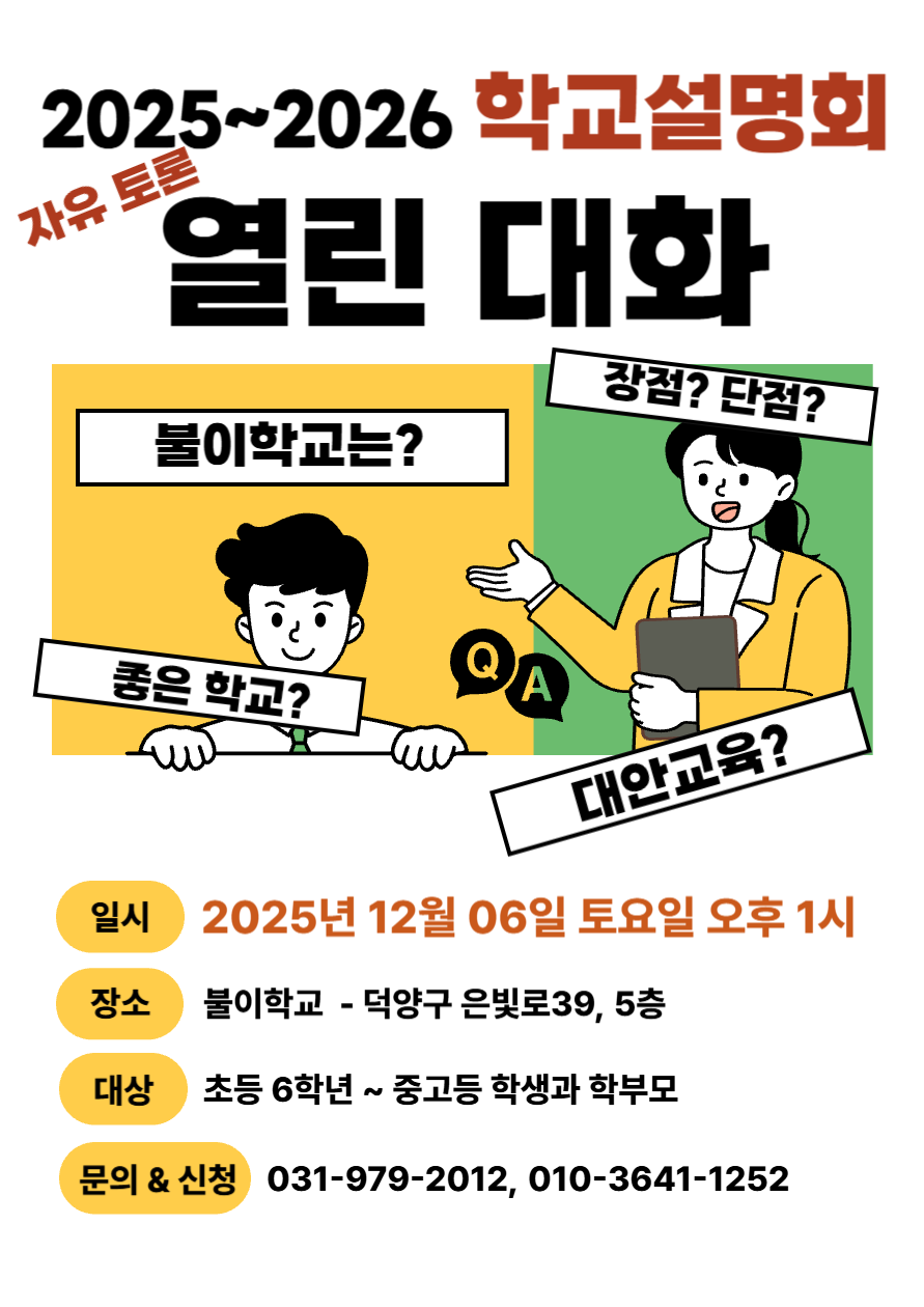 * 장소 : 불이학교 (경기도 고양시 덕양구 은빛로 39, 세은빌딩 5층)