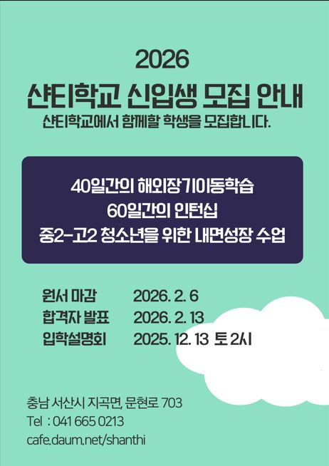 2026년 샨티학교 신입생 모집 안내