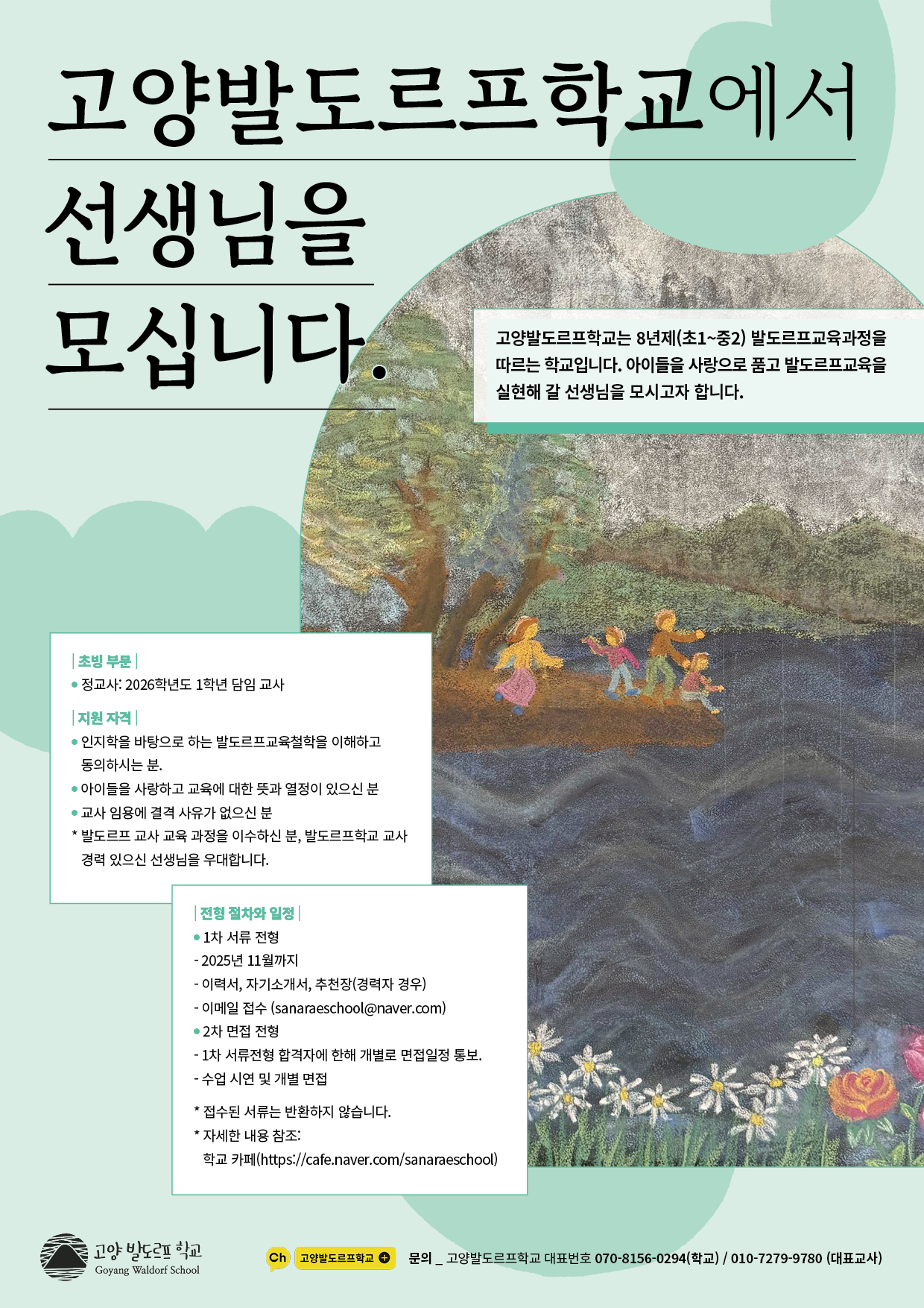 고양발도르프학교에서 2026년도 1학년 담임교사를 모십니다.