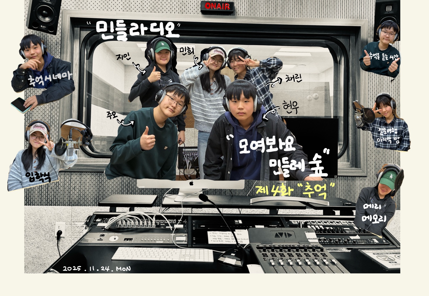 앞에 나서는 것이 매우 부끄러운 멤버들이지만, 녹음실에 앉아 마이크를 잡는 순간.. 전문 진행자 못지 않는 화려한 언변과 매력적인 목소리로 모두를 깜짝 놀라게 하기도 합니다.